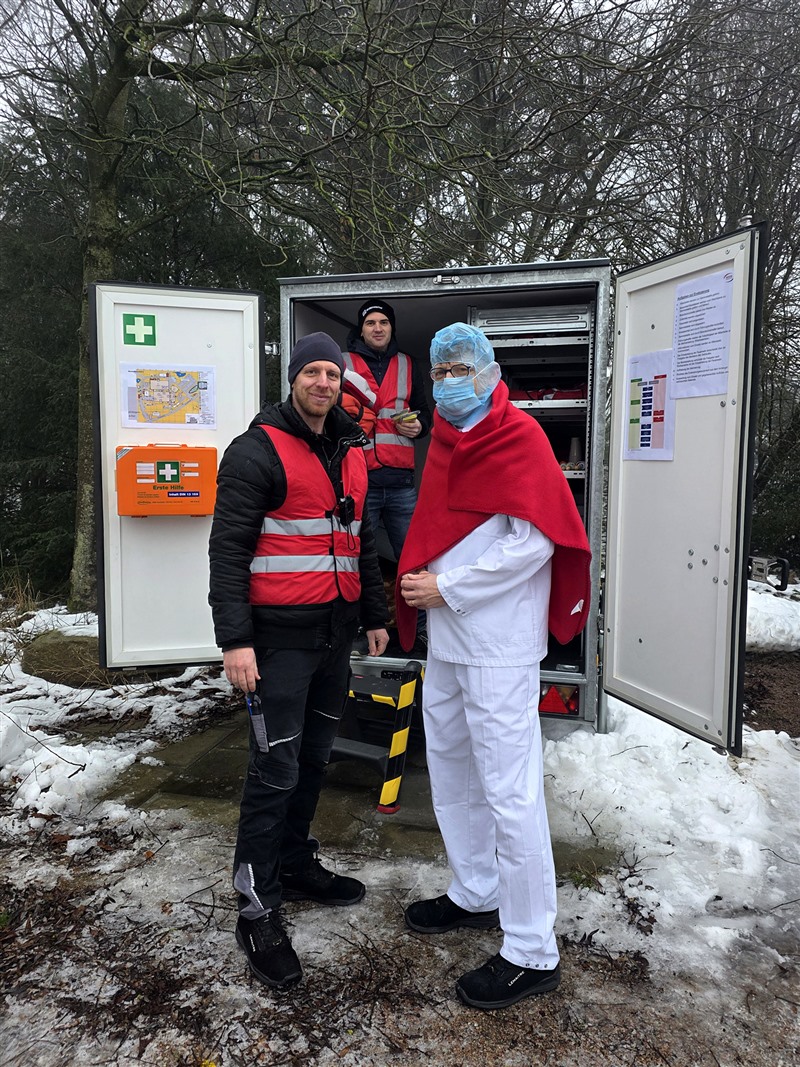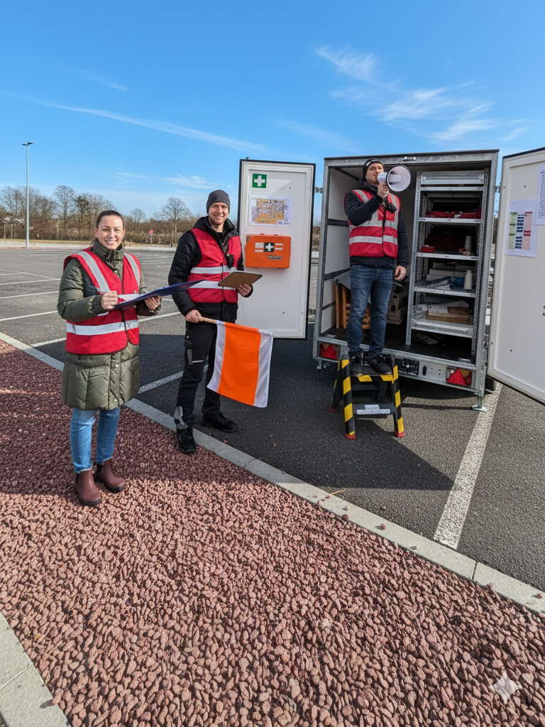 Einen Ort schaffen, der im Notfall schnelle Orientierung gewährleistet, sowohl für Mitarbeitende als auch für Brandschutzfachkräfte. Mobil, auf minimaler Fläche, ohne Bedarf an speziellen Genehmigungen. Die Ausstattung ist schnell am Sammelpunkt griffbereit. Verhaltensanweisungen, Megafon und warme Kleidung sind verfügbar. Hilfsmittel sind immer zentral und sicher verwahrt.