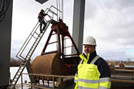 Im Unternehmen RMKS Rhein Main Kies und Splitt GmbH wurde von Heinz Schlecht eine fest installierte schwenkbare Treppen-Leiter mit integrierter Arbeitsbühne entwickelt, von der aus die Arbeiten am Greiferkopf jetzt sicher ausgeführt werden können. Die mit rutschsicher ausgeführten Treppenstufen und festen Handläufen versehene Leiter kann aufgrund eines optimierten Anstellwinkels auch mit Werkzeug sicher begangen werden.